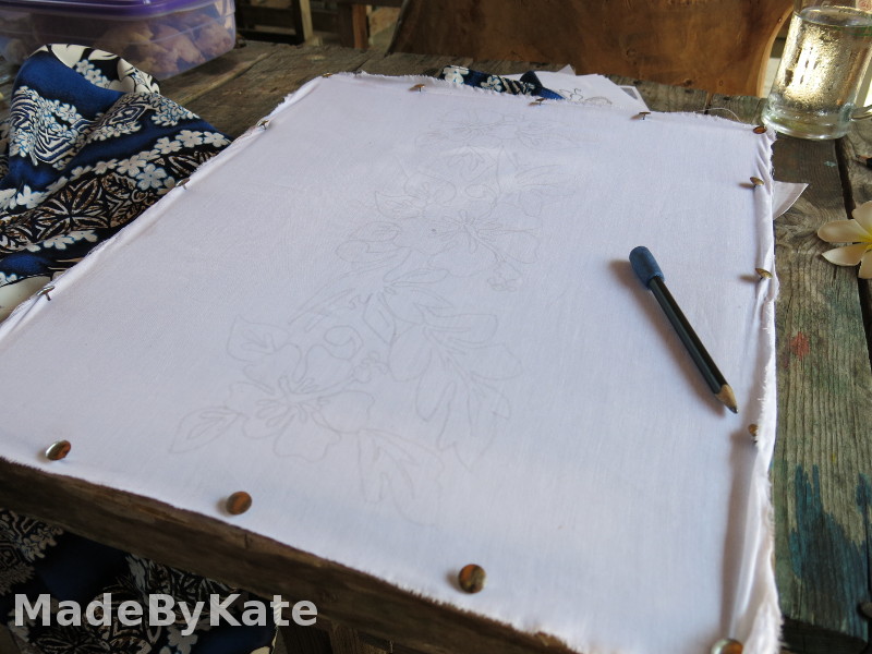 Il primo passo è disegnare a matita sulla stoffa, diciamocela tutta, io ho ricalcato 😉 Ultimata la bozza, ho ripassato i contorni con la cera d’api, usando un strumento chiamato canting (pronuncia ‘cianting’), un piccolo imbuto con un beccuccio da cui esce la cera liquida. Nel canting appena riempito la cera è calda ed esce velocissima, questo è il momento per fare i disegni più spessi e fare passaggi veloci, altrimenti si formano dei gocciolini di cera che rimarranno bianchi. I particolari più piccoli devono essere ripassati con la cera più fredda, che esce dal beccuccio più lentamente. Facile a dirsi…ma non a farsi!