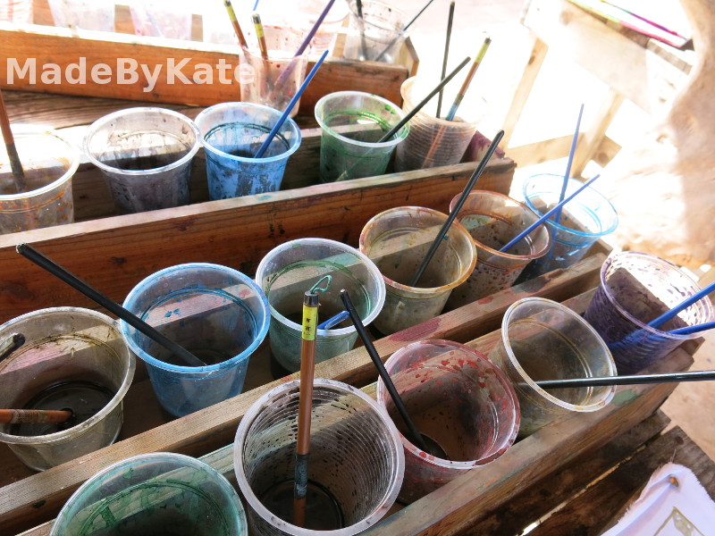 Adesso arriva il passaggio facile, il colore! E’ un po’ come si faceva da bambini con gli album, bisogna colorare all’interno dei contorni disegnati con la cera. Il colore è molto liquido, basta appoggiare il pennello sulla stoffa e tutta una parte racchiusa dalla linea di cera si riempie. Ecco perché le linee disegnate con la cera devono essere tutte unite….sennò il colore scappa 🙂